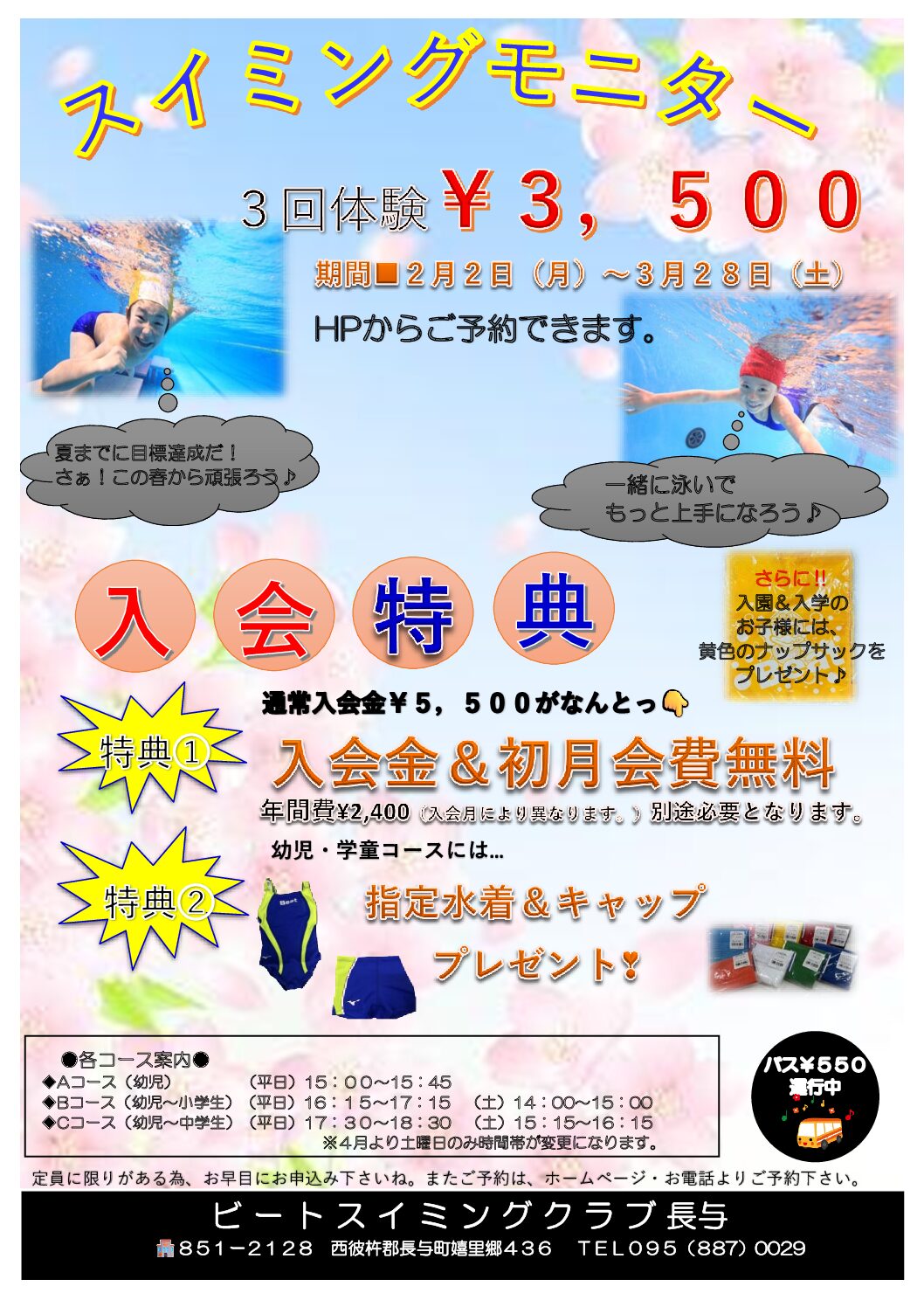 3回体験¥3,500にてスイミングモニターキャンペーンをおこないます。