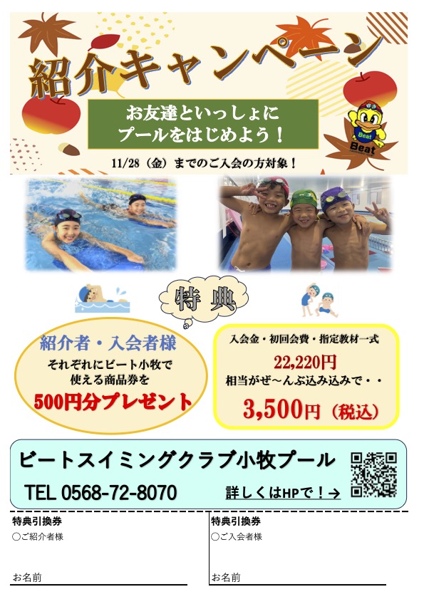 平素はビートスイミングクラブ小牧のホームページをご覧いただき、ありがとうございます。
